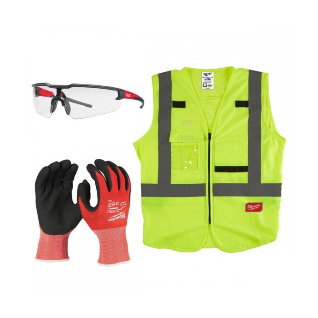 Предпазно облекло Milwaukee 4932479959 е професионален комплект, създаден да осигурява надеждна видимост, защита и удобство по време на работа. Жълтата светлоотразителна жилетка Milwaukee в размер L/XL с артикулен номер 4932471890 предлага десет функционални джоба и специален прорез за съвместимост с предпазни колани, осигурявайки висока видимост и практичност във всяка работна среда. Към комплекта е включен чифт ръкавици с клас на защита от срязване 1/A, размер XL/10 и номер 4932471418. Те имат полиуретаново покритие на дланта за сигурен захват и технология SMARTSWIPE™, която позволява работа със сензорни екрани без сваляне на ръкавиците. Завършек на набора са прозрачните защитни очила с артикулен номер 4932478763, оборудвани с покритие против надраскване и замъгляване за ясна и надеждна видимост. Този комплект предоставя балансирана комбинация от комфорт, защита и функционалност, подходяща за разнообразни професионални дейности.