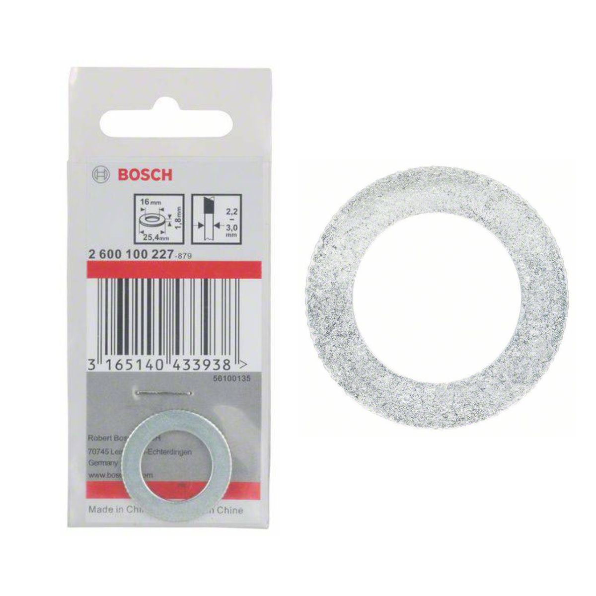 Преходна втулка за циркулярен диск Bosch 2600100227 е за дискове на Bosch и е с подходящ отвор за съответствие с циркулярната машина. Външният диаметър на втулката е 25.4 мм, а вътрешният (отворът) – 16 мм. Дискът е с дебелина 1,8 мм.