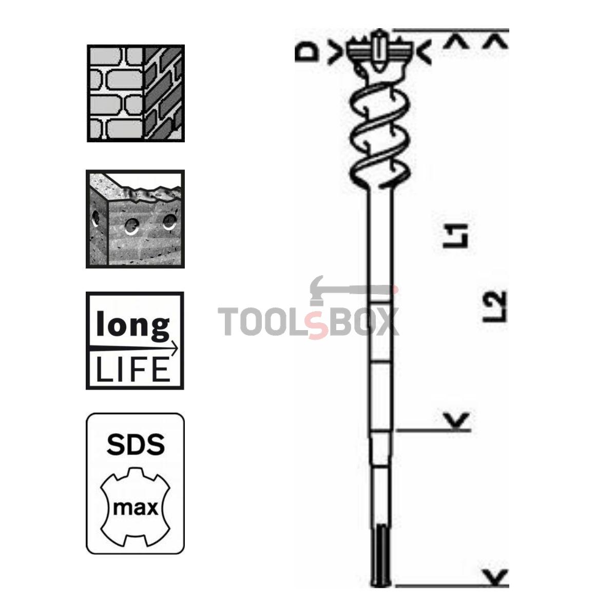 Проходното свредло на BOSCH SDS-max-9 е предназначенo за пробиване на отвори в бетон, зидария и варовикови тухли, например за външни кабелни и тръбни връзки. Масивно свредло с бормашина с форма на камбана, асиметрично разположени твърдосплавни пластини и центриращ твърд режещ ръб. Голямата U-образна спирала осигурява добро отстраняване на праха. Страхотен за всички перфоратори с патронник SDS-Max.
