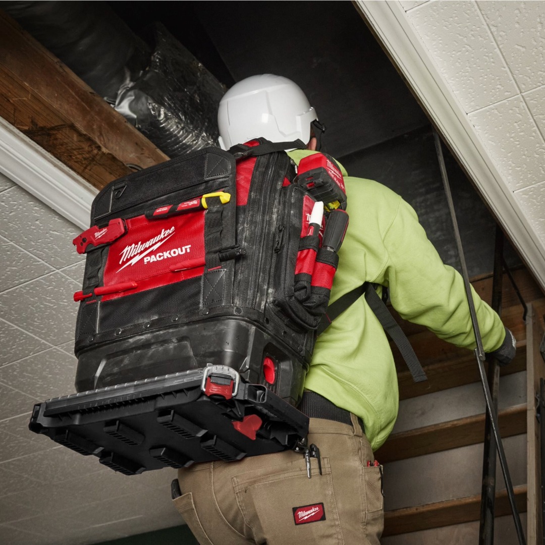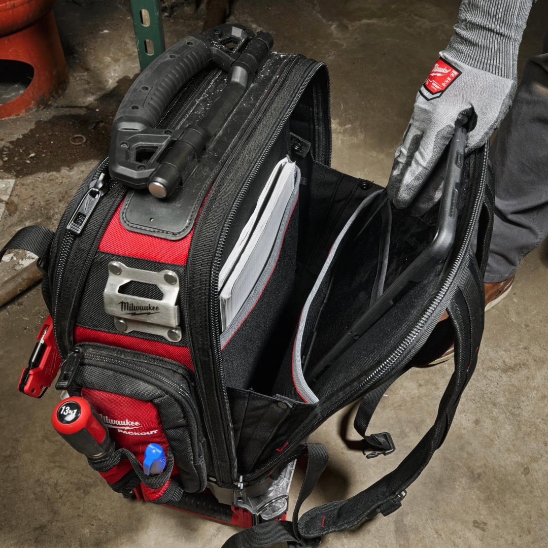 Раница за инструменти Milwaukee 4932498633 е проектирана за максимална издръжливост, организация и комфорт при интензивна професионална употреба. Изработена е от високоустойчив балистичен материал 1680D и 1800D, който осигурява дълъг експлоатационен живот дори в тежки условия. Разполага с цели 42 джоба, позволяващи отлично подреждане на ръчни и електроинструменти, аксесоари и консумативи, като същевременно издържа натоварване до 22,7 кг. За удобство при носене раницата е оборудвана с омекотен гръб и подплатени презрамки, които намаляват умората при продължителна работа. Ергономичната дръжка улеснява пренасянето, а конструкцията позволява раницата да се поставя легнала, за да пести място. Формованата основа PACKOUT™ предпазва съдържанието от влага, прах и отпадъци и осигурява пълна съвместимост с модулната система за съхранение Milwaukee PACKOUT™.
