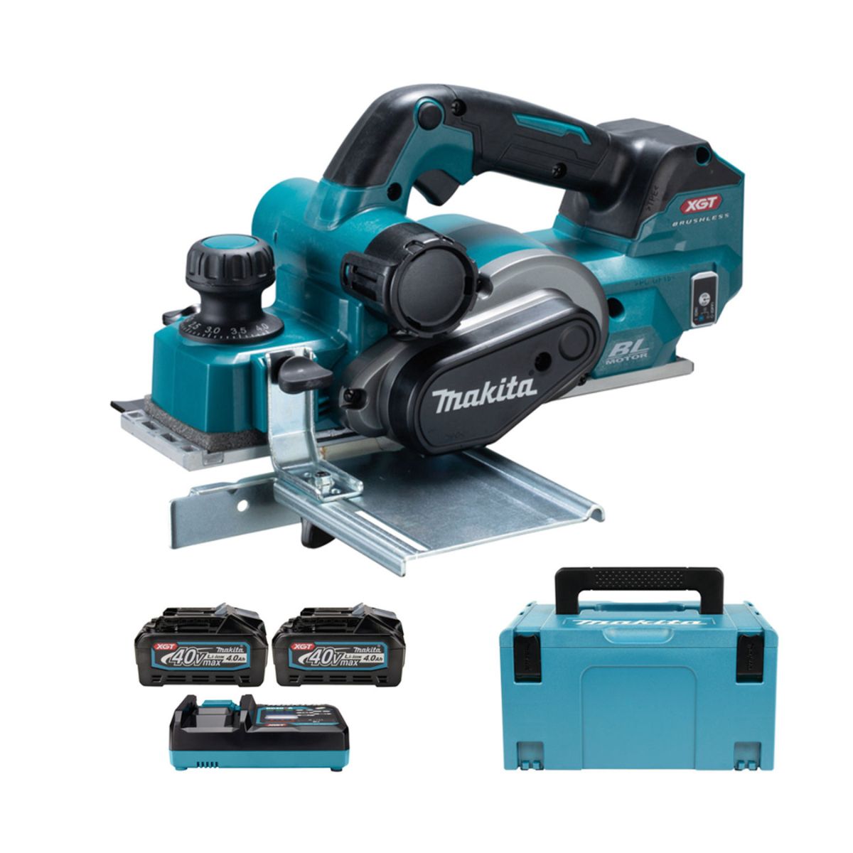 Ренде Makita KP001GM201 е с високоефективен безчетков двигател, захранван от 40V XGT Li-Ion батерия за повече работа с едно зареждане. Копче за регулиране на дълбочината на рендосване с удобна скала с деления на всеки 0,10мм, достигайки до 4мм дълбочина на рязане. С функция за плавен старт, електрическа спирачка и функция против рестартиране за максимална безопасност и комфорт на оператора. Разполага с предна метална основа с 3 канала подходящи при скосяване и метален страничен водач. Стърготините могат да се изхвърлят от двете страни на инструмента, а опорната плоча защитава обработваната повърхност и ножовете от надраскване и повреди, дори ако инструментът се поставя върху обработваната повърхност преди пълното спиране на барабана. Със здрав корпус и ергономична ръкохватка с противоплъзгащо еластомерно покритие, осигуряващо по-надежден и удобен захват. Оборудвано със система AWS за свързване на рендето към съвместими прахоуловители с безчжична Bluetooth технология за автоматично включване/изключване.