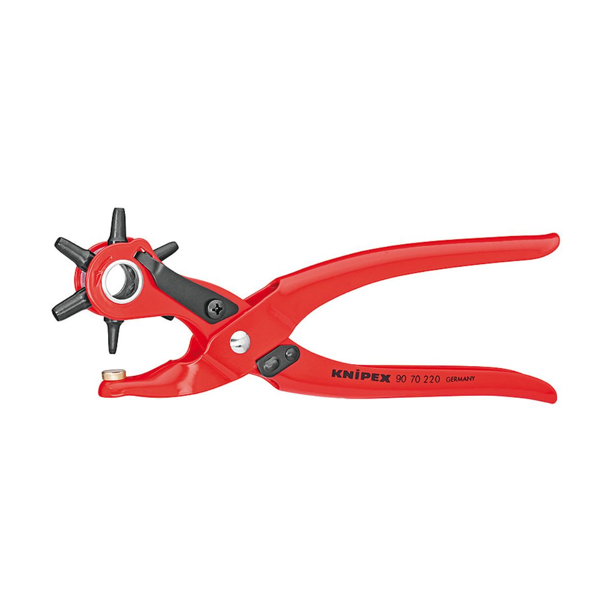 Револверни клещи замби Knipex 90 70 220 са с дължина 220 мм и са изработени от специална закалена инструментална стомана. Те имат прахово покритие, което осигурява надеждна защита срещу ръжда и удължава техния живот. Използват се за пробиване на отвори в кожа, текстил и пластмаса. Разполагат с 6 отвора с различни диаметри: 2.0 мм, 2.5 мм, 3.0 мм, 3.5 мм, 4.0 мм и 5.0 мм, което позволява на потребителя да избира подходящия размер за конкретната задача. Освен това, те са оборудвани с пружина за отваряне, която улеснява работата с тях, както и с заключващ механизъм, който ги държи затворени за по-голяма безопасност и удобство при съхранение.