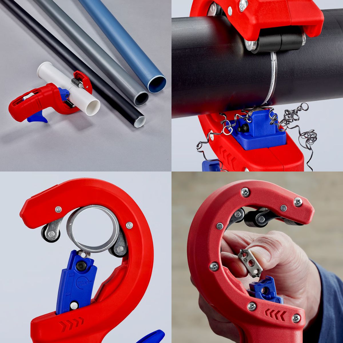 Резачка за тръби Knipex 90 23 01 BK е прецизен инструмент, създаден за бързо и чисто рязане на пластмасови тръби за битови отпадъчни води с диаметър до 50 мм. Изработен е от устойчива пластмаса, подсилена със стъклени влакна, което осигурява лекота и здравина при продължителна употреба. Оборудван е с реверсивно острие с двоен режещ ръб, пружинен механизъм и саморегулиращи се ролки със сачмени лагери, изработени от висококачествена стомана. Острието се сменя бързо и лесно – без нужда от инструменти. Подходящ е и за тръби с диаметър 32, 40 и 50 мм и дебелина на стената до 2.4 мм. Позволява повторно и фино рязане при остатъчни дължини от около 10 мм, което го прави идеален за точна настройка и монтаж.