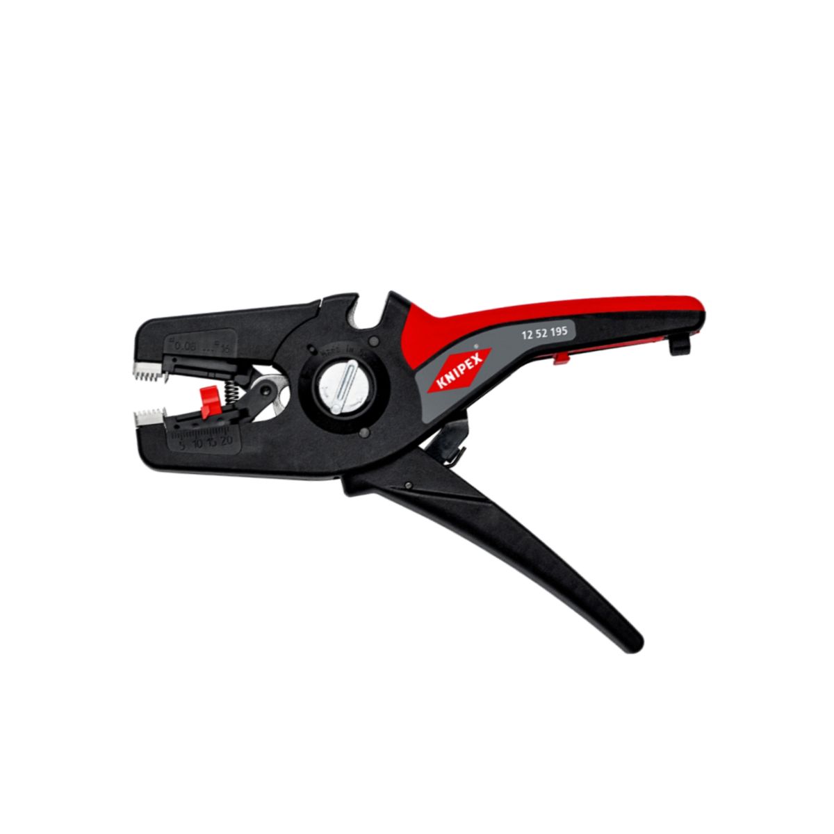 Саморегулиращи клещи за оголване на кабели Knipex 12 52 195 са иновативен инструмент, предназначен за лесно и прецизно отизолиране на фини многожилни кабели до плътни кръгли кабели в голям диапазон от 0,08 до 16 мм², използвайки само един комплект клещи. Осигуряват добро сцепление благодарение на полукръглите метални задържащи челюсти с гребенов профил, които позволяват точно рязане благодарение на параболичния оголващ нож. Фината настройка позволява прецизно настройване на ножовете спрямо специфични материали или температурни условия. С патентованата автоматика се контролира дълбочината на рязане на ножа, като нулевата точка на автоматиката може да се регулира с фини стъпки за специални работни условия, като изолационен материал и температура. Клещите са снабдени с закопчалка, която е съвместима с аксесоари за KNIPEX Tethered Tools и имат поле за етикетиране за индивидуализация. Със своя регулируем стоп за дължина клещите предоставят възможност за прецизна и повтаряема работа. Ергономичната двукомпонентна дръжка осигурява удобно боравене. Снабдени с лесно сменяема касета за ножа, която позволява бърза и лесна подмяна на ножовете при нужда.