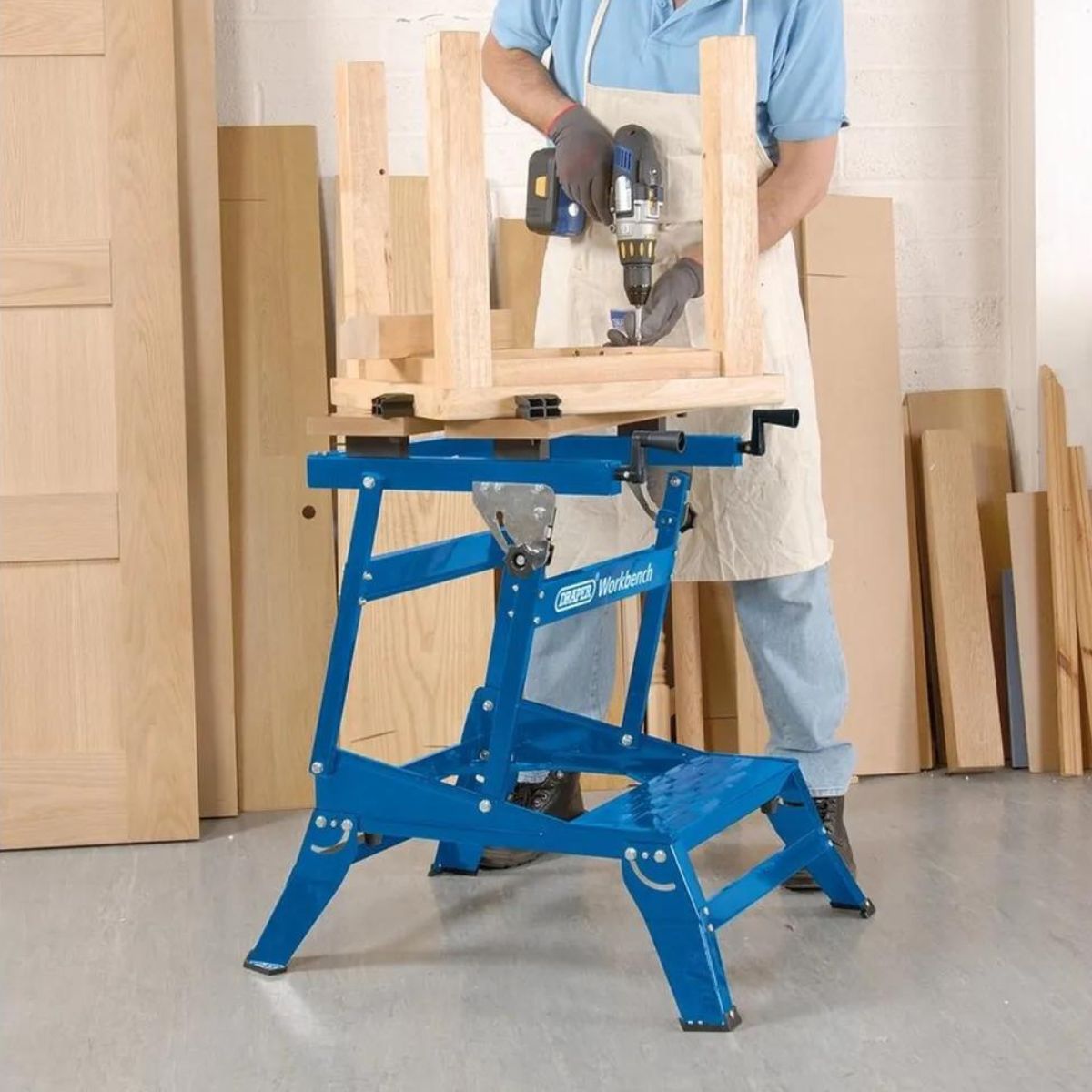 Сгъваема работна маса Draper 38121 / HDWBY/R е създадена от здрав MDF плот, разделен на две части, тя разполага с функция за бързо освобождаване на челюстта, предоставяйки удобство при употреба. Този модел на Draper, HDWBY/R позволява на потребителя да регулира работната височина според своите предпочитания. Оборудвана с ъглови стоманени крака и подсилени с крачета против хлъзгане, тя осигурява стабилност и сигурност по време на работа. Допълнително, двойното затягащо действие и 12-те отвора за захващане позволяват гъвкавост за различни видове проекти. Работната маса предоставя максимална ширина на затягане от 380 мм със зъбци за затягане, което я прави идеална за по-големи детайли. Съдържа четири пластмасови скоби, които допълнително подобряват функционалността й. Едно от ключовите предимства на Draper HDWBY/R е неговият сгъваем дизайн. Лесно се сгъва за сигурно съхранение и преносимост, което го прави отличен избор за ограничени работни пространства или за пренасяне на работната маса на различни места. Въпреки здравата си конструкция, теглото му от около 13 кг го прави относително лесен за придвижване.