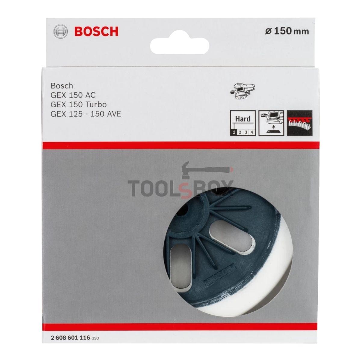 Шлифовъчният диск BOSCH 2608601116 може да се използва като шлифовъчна подложка, удължение или като резервна подложка за шлифовъчни машини. Подобрява външния вид на повърхността след шлифоване на кривини и ръбове. Специалната форма на ръбовете с намалена твърдост подобрява качеството на заобляне. Новата основа от пяна следва добре контурите на повърхността, което подобрява качеството на шлайфане. Спада към твърдите шлифовъчни подложки (сини): за грубо шлайфане на дебел материал, боя, шпакловка, мазилка и необработено естествено дърво. Гумената плоча на Bosch гаранира висококачествено отстраняване на неравности по повърхността на дървени материали, боя, мазилка и други материали, поради гъвкавостта си. Подходяща за модел: Bosch GEX 150 AC Professional.