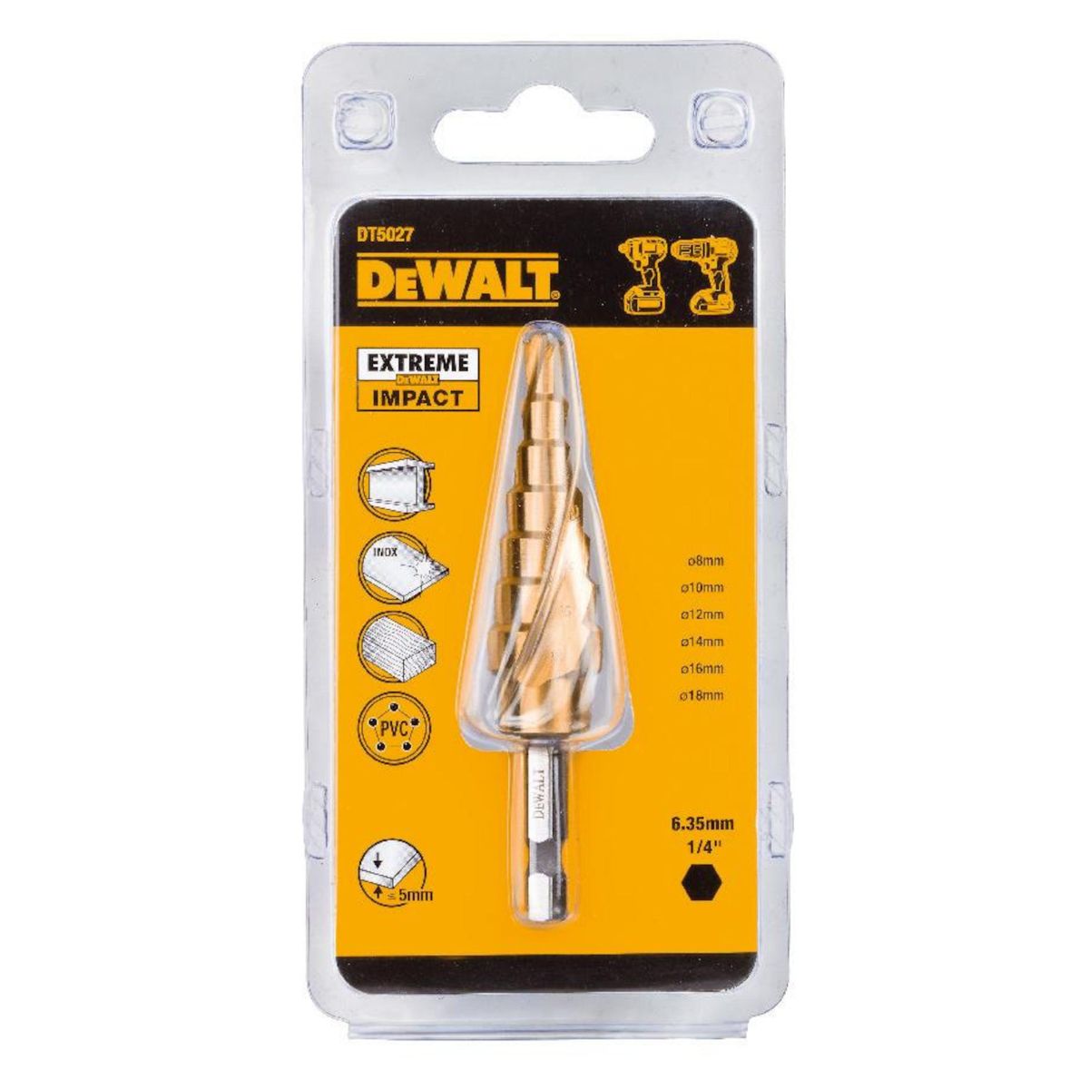 Стъпаловидно свредло за метал DeWalt DT5027 е подходящо за професионална употреба за пробиване в метал със стъпка от 8 до 18 мм. Накрайникът Split Point осигурява ефективно пробиване и дълъг експлоатационен период. Подобрената геометрия на свредлото е с два канала за отвеждане на метални стружки. Размерите са лазерно гравирани за подобрена видимост. Шестостенната опашка 6,35 мм осигурява сигурно задържане на свредлото в различни видове патронници. Титаниево покритие за повишена устойчивост на износване, устойчивост на корозия и до 2 пъти по-дълъг живот (срещу черен оксид). Свредлото е част от Серията Extreme Impact на Dewalt – подходящо за работа с ударни винтоверти. Стъпаловидните свредла произвеждат по-чисти отвори, тъй като изрязват постепенно по-големи отвори, докато преминават през материала. Този метод премахва необходимостта от превключване между няколко размера на свредлото.