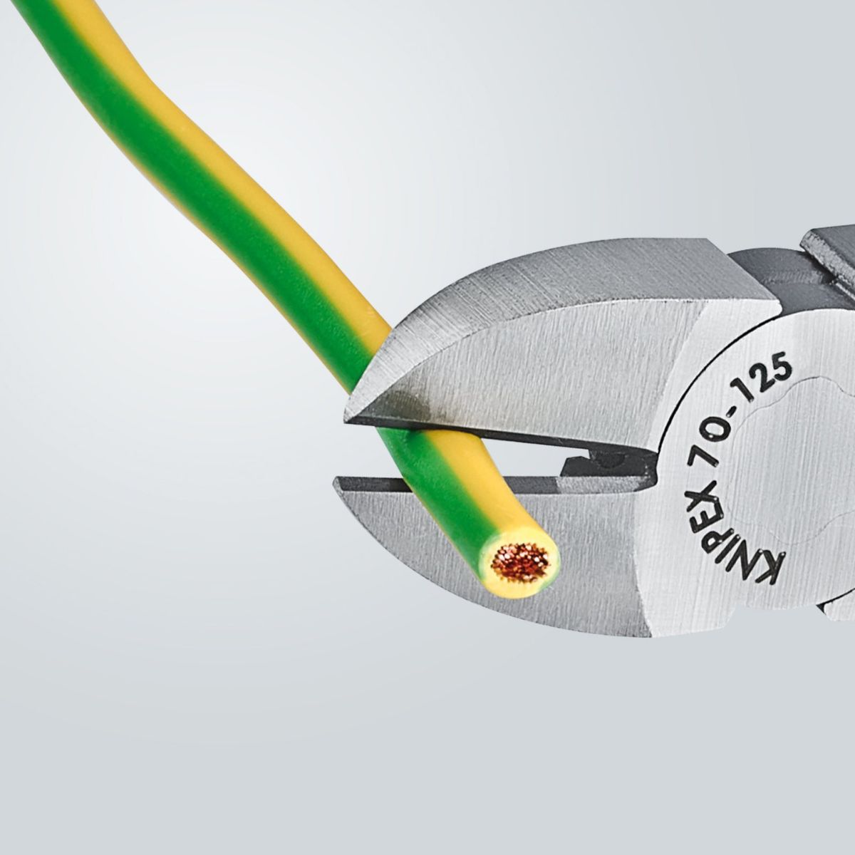Странични клещи резачки Knipex 70 01 125 са изработени от специална ванадиева стомана, която е кована и маслено закалена. Този процес на изработка гарантира висока здравина и издръжливост на инструмента, като осигурява и дълъг експлоатационен живот. Тези клещи са предназначени за универсална употреба и са идеални за различни видове рязане. Могат да режат мека тел с диаметър до 3 мм, твърда тел с диаметър до 1.2 мм и тел със средна твърдост с диаметър до 2 мм. Режещите ръбове на клещите са допълнително индукционно закалени с твърдост около 62 HRC, което гарантира остър и прецизен рязане дори на по-твърди материали. Със своята тясна глава, тези клещи са подходящи за използване в труднодостъпни места, като предлагат удобство и прецизност при работа.
