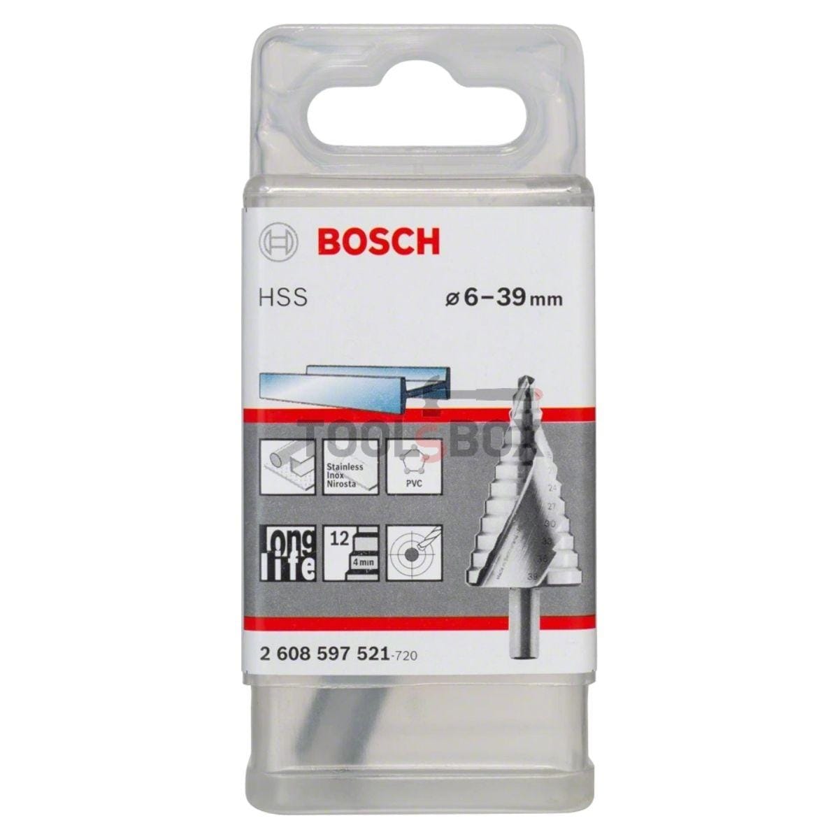 Стъпаловидно свредло за метал на BOSCH е с 12 степени на пробиване, от 6-39 мм. Има опашка с три повърхности и осигурява гладко пробиване в няколко диаметъра с един инструмент. Изработено е от материали с висока устойчивост. Свредлото HSS осигурява гладко пробиване без чепове в няколко диаметъра с едно свредло. Идеално е за почистване, пробиване на кръгли отвори и уголемяване на съществуващи отвори. Не е необходимо предварително маркиращо пробиване, защото кръстато заточеният връх позволява лесно стартиране. CNC шлифованият спирален канал позволява оптимизирано отстраняване на стружките и по-малко вибрации за равномерно пробиване. Максималната ефективност на рязане и абсолютната гладкост са гарантирани благодарение на аксиалното и радиалното релефно шлифоване. Това стъпаловидно свредло е подходящо за използване с тънки материали като цветни метали, пластмасови листове, ламарина, пластмаса и неръждаема стомана. Стъпаловидното свредло е изработено от HSS (бързорежеща стомана) и предлага дълъг експлоатационен живот при използване на охлаждаща течност. Лесновидимите и трайни маркировки за диаметър на отвора са изработени чрез лазерно маркирани символи в двата канала. Наред с това, опашката с 3 повърхности предотвратява приплъзването в патронника и осигурява стабилно предаване на висок въртящ момент.