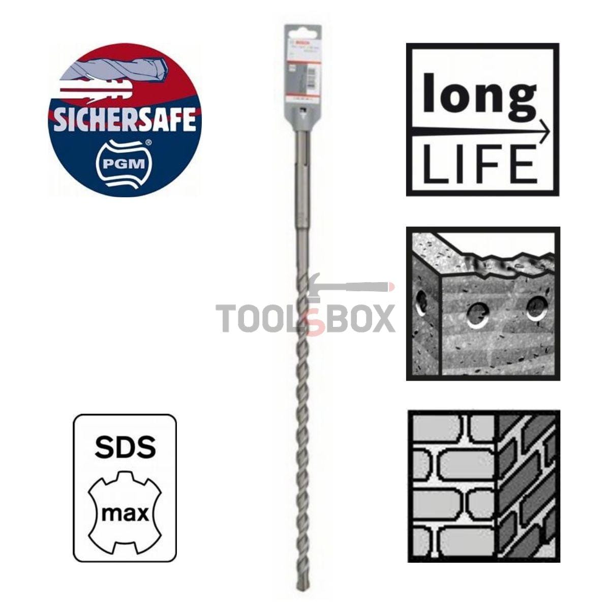 Свредлото SDS max-4 е снабдено с глава с 4 режещи ръба и предлага дълъг експлоатационен живот за работа в бетон. Дизайнът с 4 режещи ръба осигурява продължителна употреба без блокиране при пробиване в арматура. 2-каналната U-образна форма също удължава експлоатационния живот, предлагайки добро отстраняване на праха. Здравината е подсигурена и чрез високоиздръжливия карбиден материал на свредлото, който е устойчив на износване.