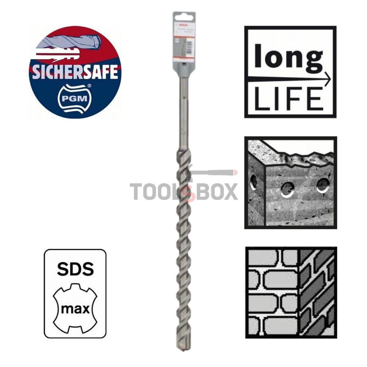 Свредлото SDS max-4 е снабдено с глава с 4 режещи ръба и предлага дълъг експлоатационен живот за работа в бетон. Дизайнът с 4 режещи ръба осигурява продължителна употреба без блокиране при пробиване в арматура. 2-каналната U-образна форма също удължава експлоатационния живот, предлагайки добро отстраняване на праха. Здравината е подсигурена и чрез високоиздръжливия карбиден материал на свредлото, който е устойчив на износване.