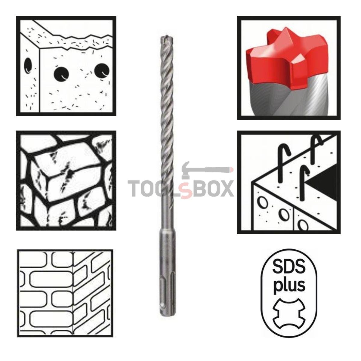 Свредлото за армиран бетон на BOSCH осигурява дълготрайна ефективност при пробиване в бетон. Неговата изцяло карбидна глава с 4 режещи ръба е изработена от най-висококачествен карбид, който подсилва главата и осигурява изключителна удароустойчивост. Равномерното разпределение на пробивна мощност гарантира, че няма загуба на мощност, което увеличава общия експлоатационен живот. Това свредло е предназначено за пробиване с перфоратор в зидария, бетон и стоманобетон. Съвместимо е с перфоратори с SDS plus държачи.