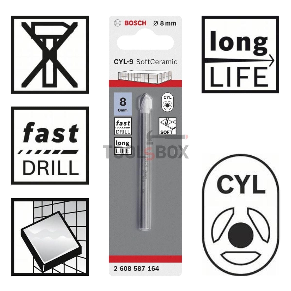 Свредлото BOSCH CYL-9 SoftCeramic с диаметър 8 мм и дължина 80 мм за керамични плочки е стандартният избор при пробиване в плочки. Подходящо е за сухо пробиване без смазване за удобна употреба. Има опростен безканален дизайн, особено подходящ за пробиване в керамични плочки. С висока устойчивост на износване и дълготрайна ефективност при пробиване на отвори в стъкло, керамика и различни видове фаянс.