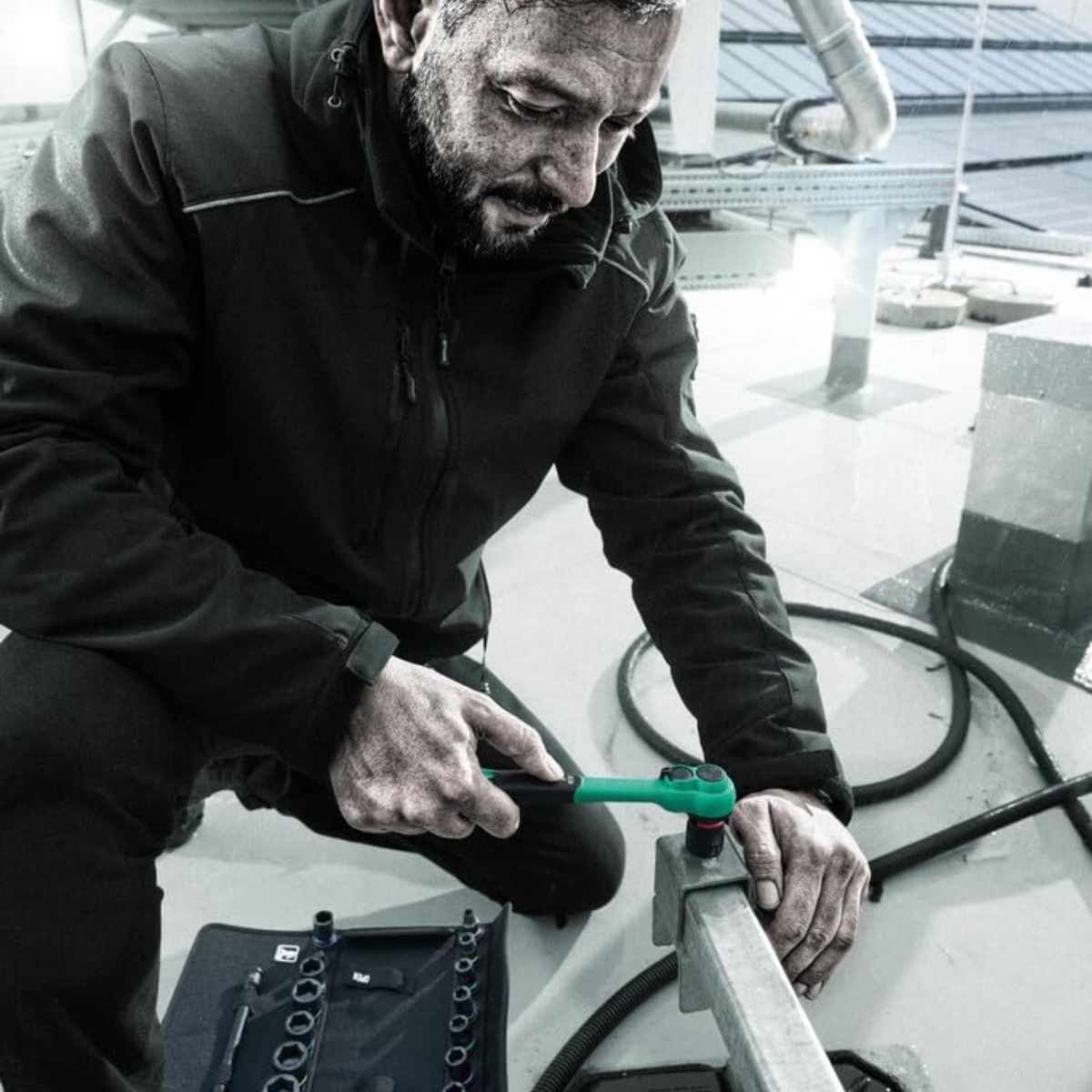 Тресчотка Wera 05005540001 е проектирана с фина предавка с 80 зъба, което осигурява изключително малък ъгъл на връщане от само 4,5°, за прецизна работа дори в ограничени пространства. Пластмасовото покритие на тресчотката придава приятно усещане при захват, предпазва обработваните повърхности от повреда и допринася за комфорта при продължителна употреба. Изключително тънкият и ергономичен дизайн на инструмента го прави подходящ за работа в много тесни пространства, като същевременно осигурява надеждност и удобство.