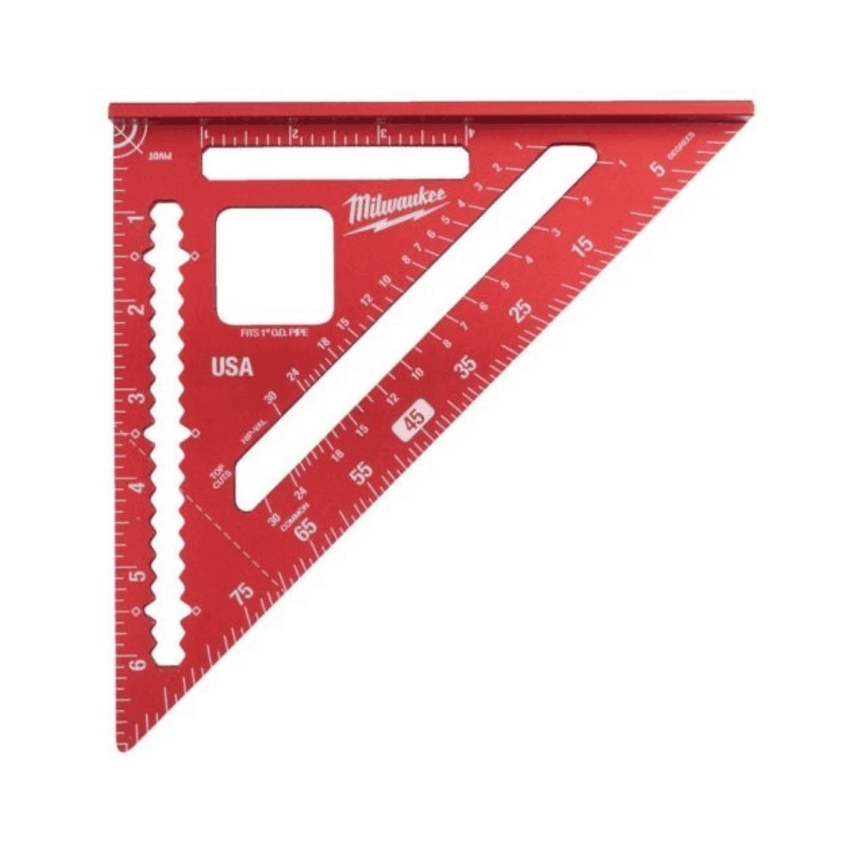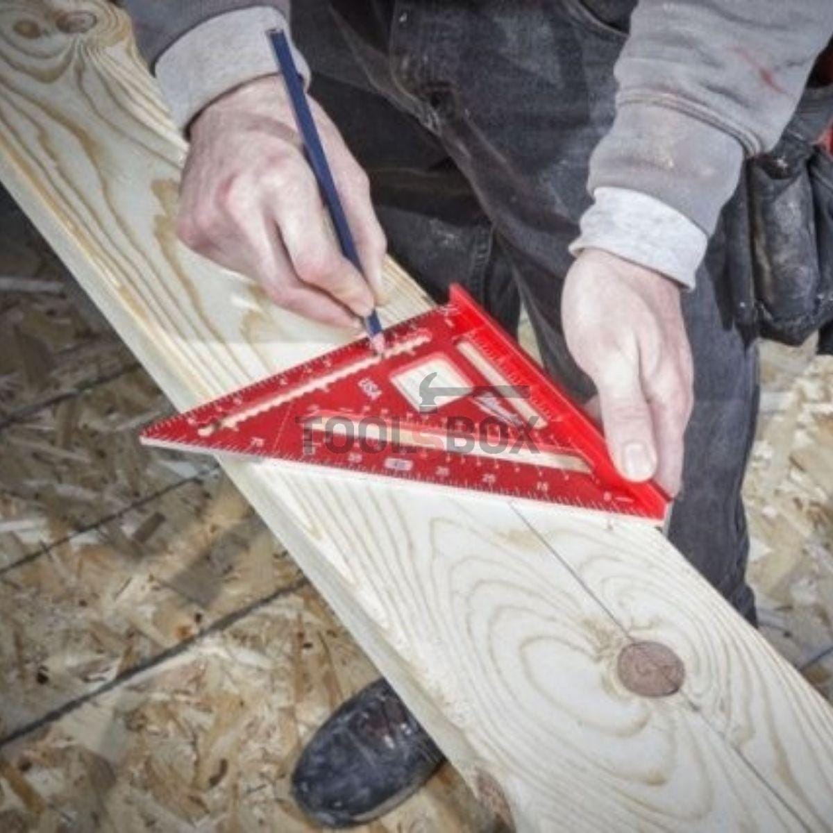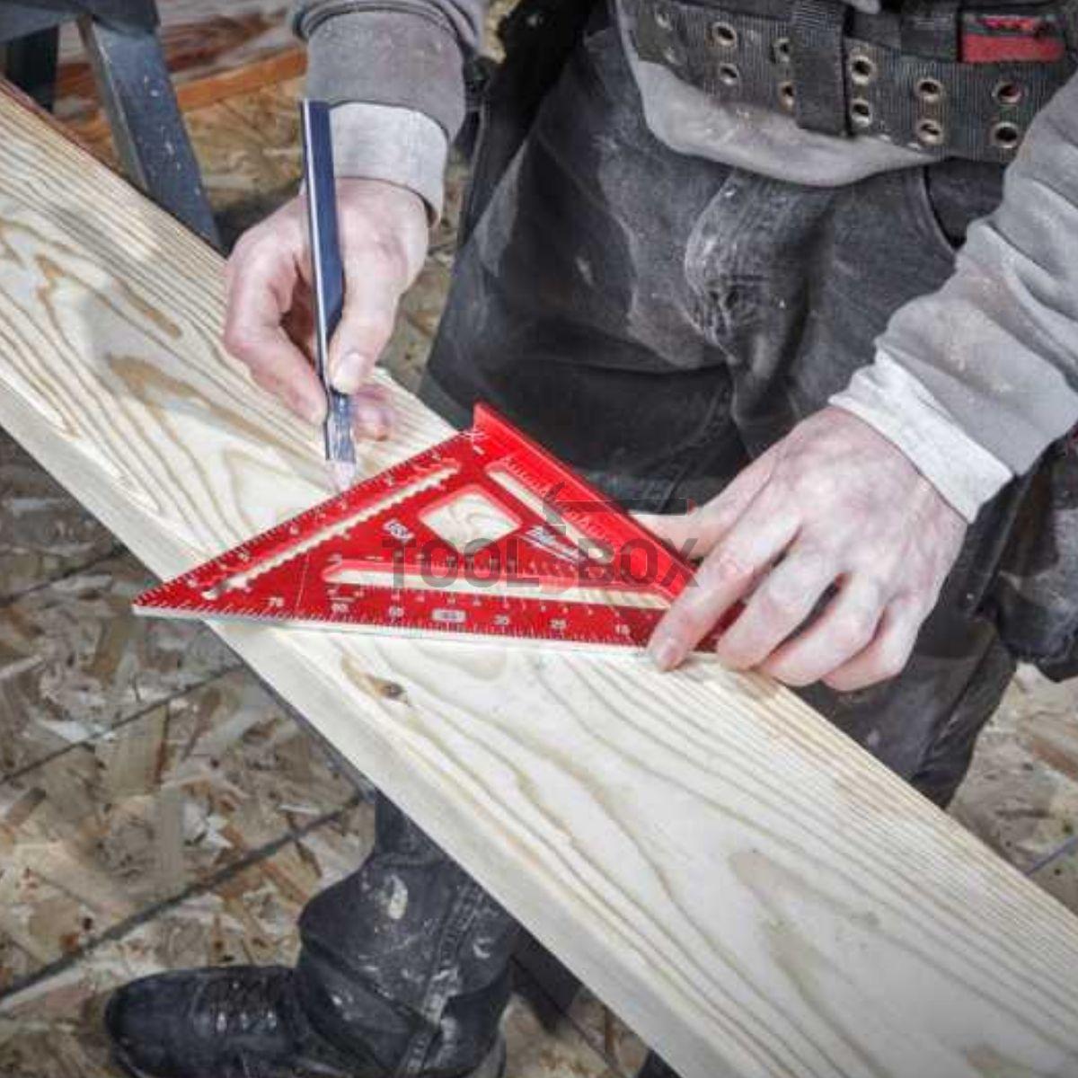 Дърводелският триъгълник 4932472123 на Milwaukee RAFTER е с по-здрава рамка и е най-гъвкавият дърводелски ъгъл. Прорези от 25 мм до 145 мм ви позволяват лесно и точно да маркирате дървен материал. Подсилената рамка осигурява по-голяма издръжливост на работното място, докато лазерно гравирани, добре видими маркировки улесняват разчитането на оформлението на гредите. Прецизна скала на интервали от 5 мм, основата с ширина 28 мм осигурява сигурен захват и прецизност. Лазерното маркиране гарантира най-висока точност и четливост. Държач за тръба 25 мм – благодарение на квадратния отвор е възможно да се захване сигурно тръбата по време на рязане.