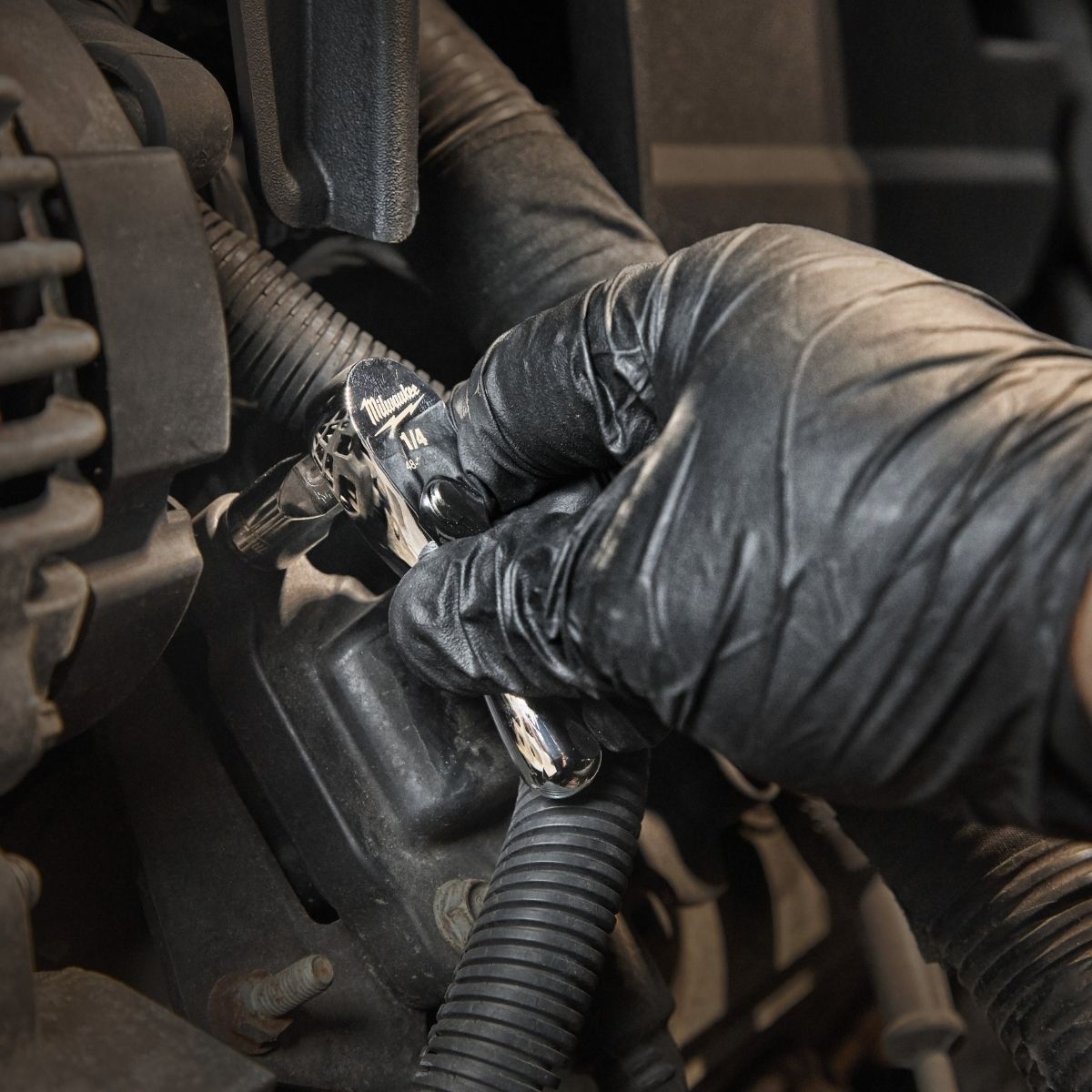 Tресчотка Milwaukee 4932479646 представлява мощен инструмент, включващ 90 зъба и 4° дъгова люлка, идеален за работа в тесни и ограничени работни пространства. Тънката профилна глава и лоста за посока на изравняване ви осигуряват по-добър достъп до труднодостъпни места.