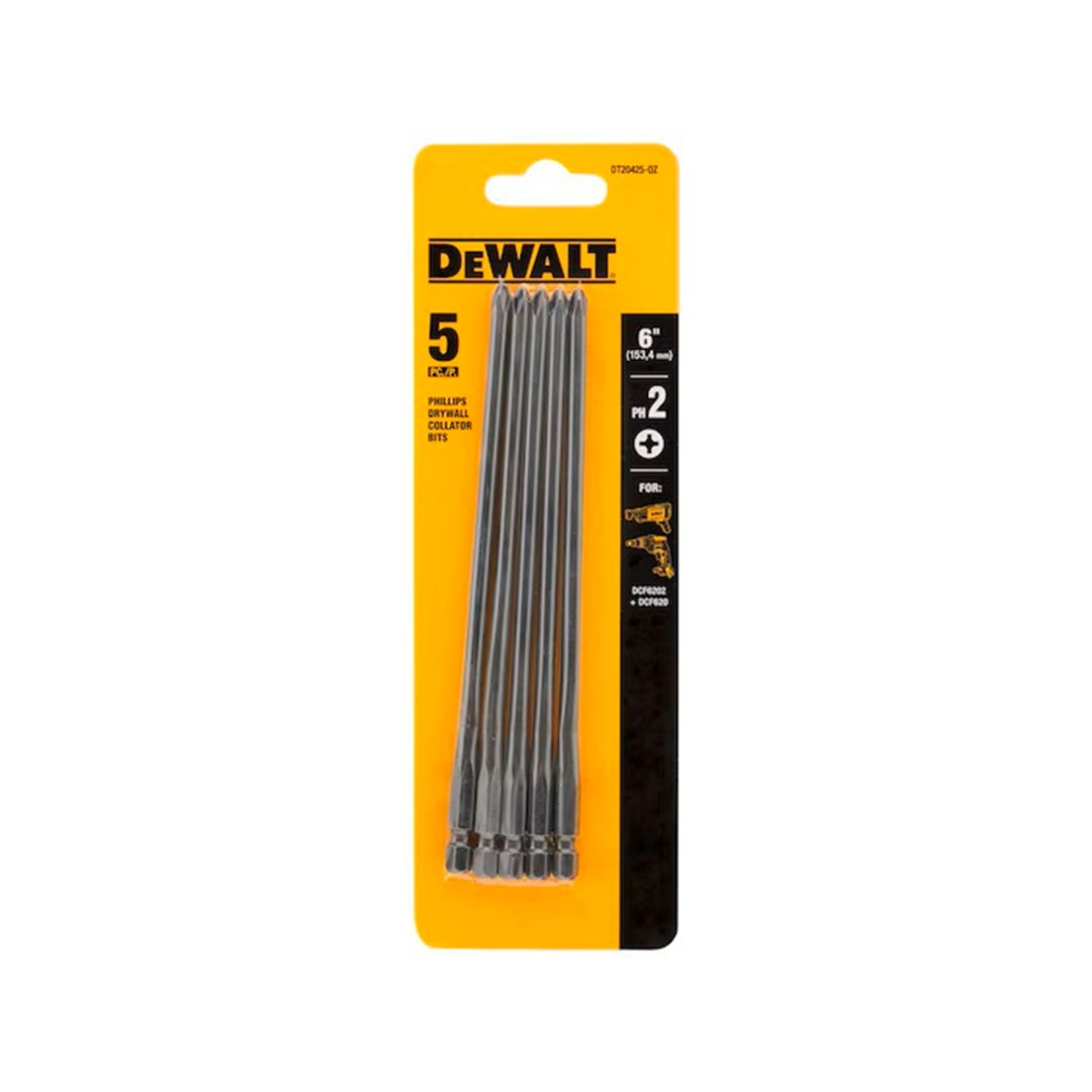 Удължени накрайници DeWALT DT20425 включва пет бита с дължина 153.4 мм, създадени за прецизна и ефективна работа при серийно завиване на винтове. Всеки накрайник е със стандартна шестостенна опашка 1/4″, която позволява бърз и сигурен монтаж към съвместими инструменти. Битовете са специално проектирани за използване с приставката за серийно завиване DeWALT DCF6202 и са напълно подходящи като резервни елементи за винтоверти DeWALT, предназначени за сухо строителство. Изработката от висококачествен материал гарантира дълъг експлоатационен живот и надеждна производителност при интензивна професионална употреба.
