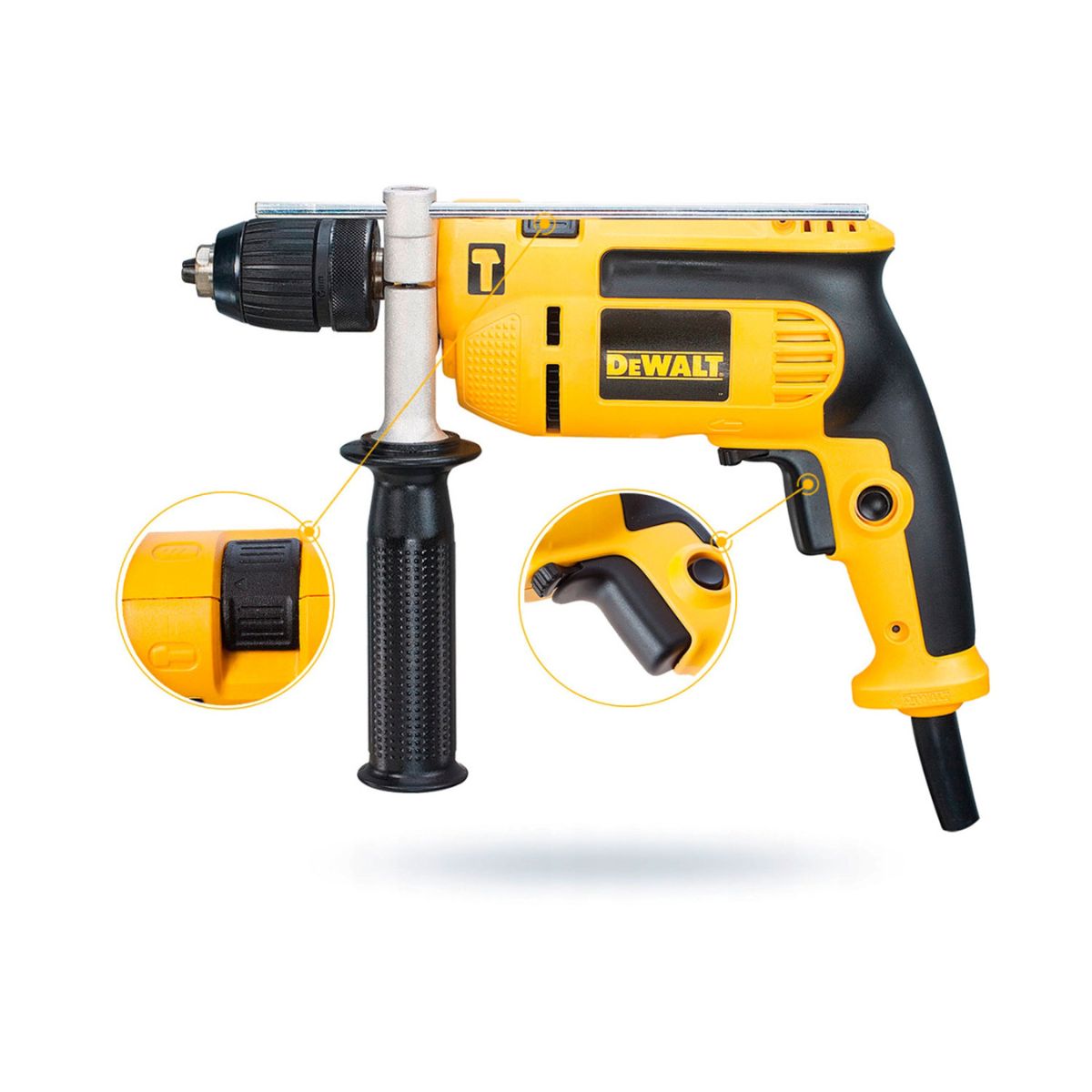 Ударна електрическа бормашина DeWALT DWD024S е мощна и удобна ударна бормашина с 701W мощност, предназначена за пробиване в различни материали като бетон, стомана и дърво. С нейния компактен и ергономичен дизайн можете да работите дори в труднодостъпни места. Гумената ръкохватка осигурява комфорт и стабилност по време на работа, а плавното регулиране на оборотите позволява на потребителя да контролира скоростта за по-голямата прецизност. Инструментът разполага с реверсивна функция, което го прави подходящ за работа като отвертка. Безключовият патронник с обхват от 1.5 до 13 мм гарантира стабилно задържане на накрайника и е подходящ за ударни приложения. Удобната допълнителна ръкохватка позволява настройването на позицията за максимален комфорт и намаляване на вибрациите по време на работа.