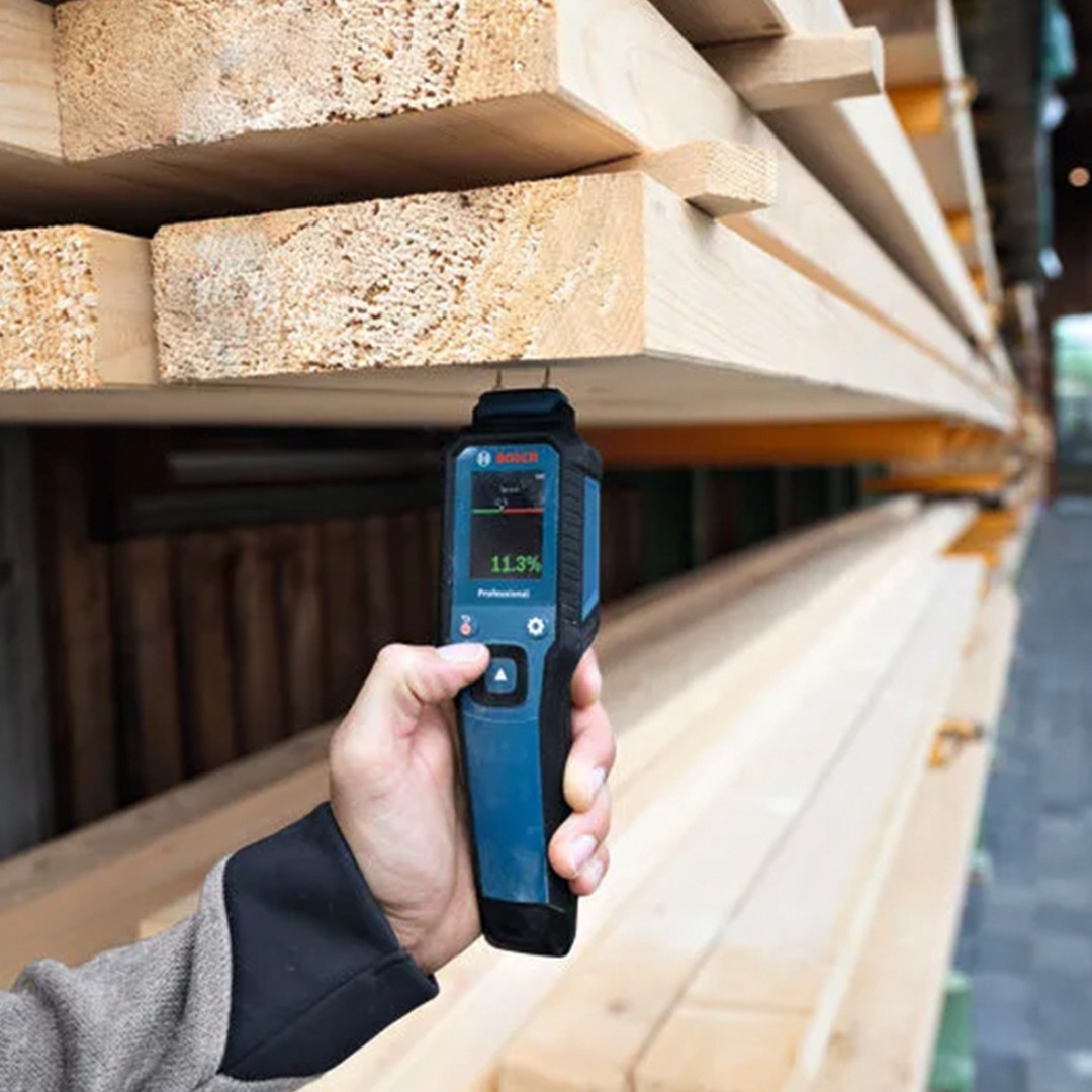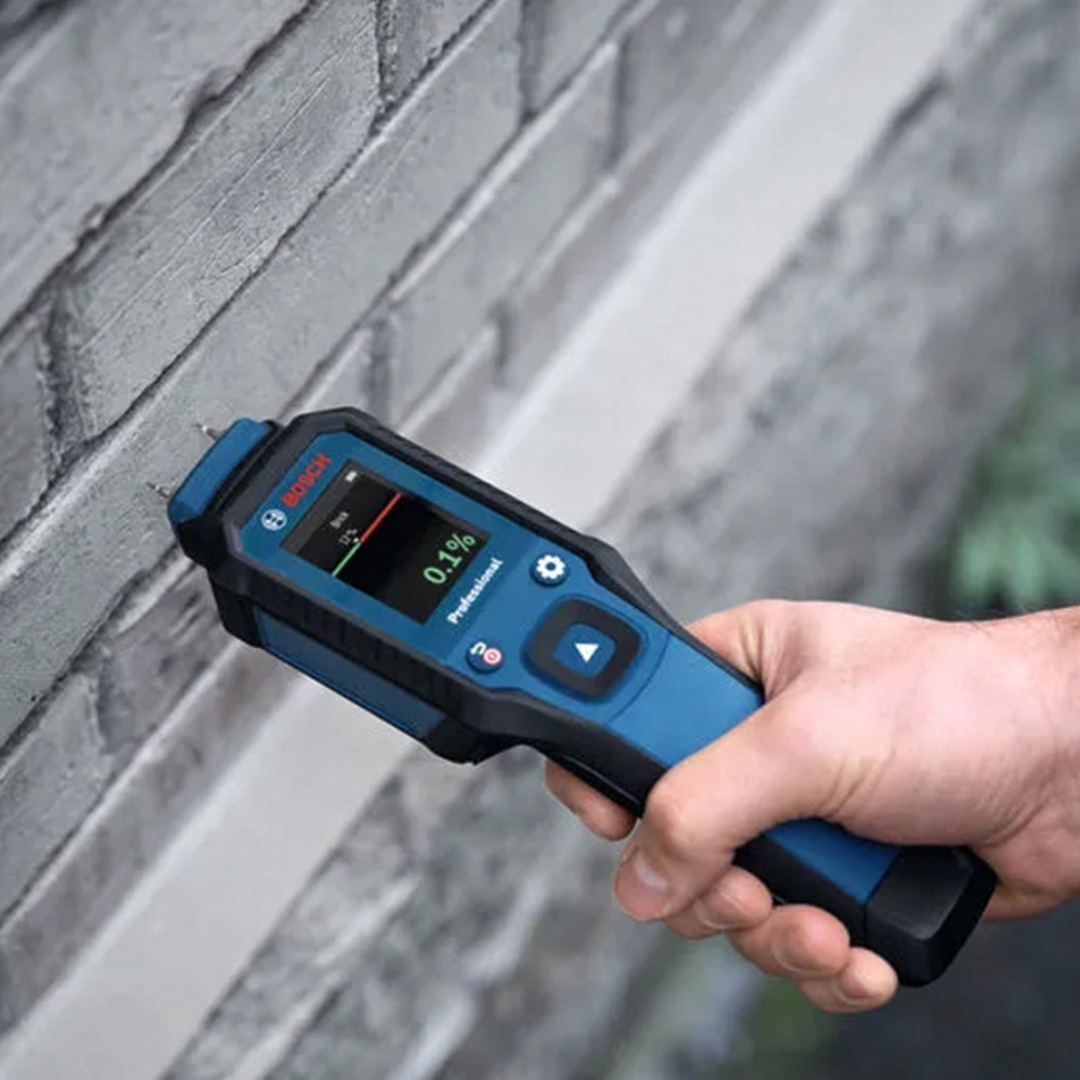 Влагомер Bosch GMP 1-13 измерва влажността в 37 вида дърво и 10 вида строителни материали, като резултатите се показват на цветен LCD екран с висок контраст на 36 езика. Регулируемата прагова скала улеснява интерпретацията на стойностите, а автоматичният автотест гарантира точност преди всяко използване. Уредът разполага с централен бутон за задържане на измерванията и позволява запазване и преглед на последните 3 резултата. Здравият корпус с гумирано покритие и защита IP65 осигуряват надеждна работа дори при тежки условия. Подходящ е за монтажници на гипсокартон, зидари, дърводелци и бояджии, като помага за определяне на правилните условия за боядисване или лепене на тапети, както и за точна проверка и оценка на влажността в дървени и строителни материали.