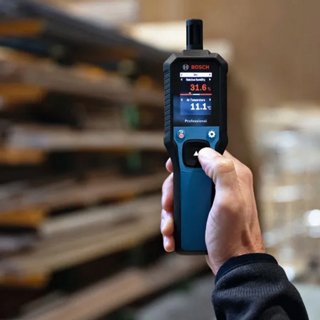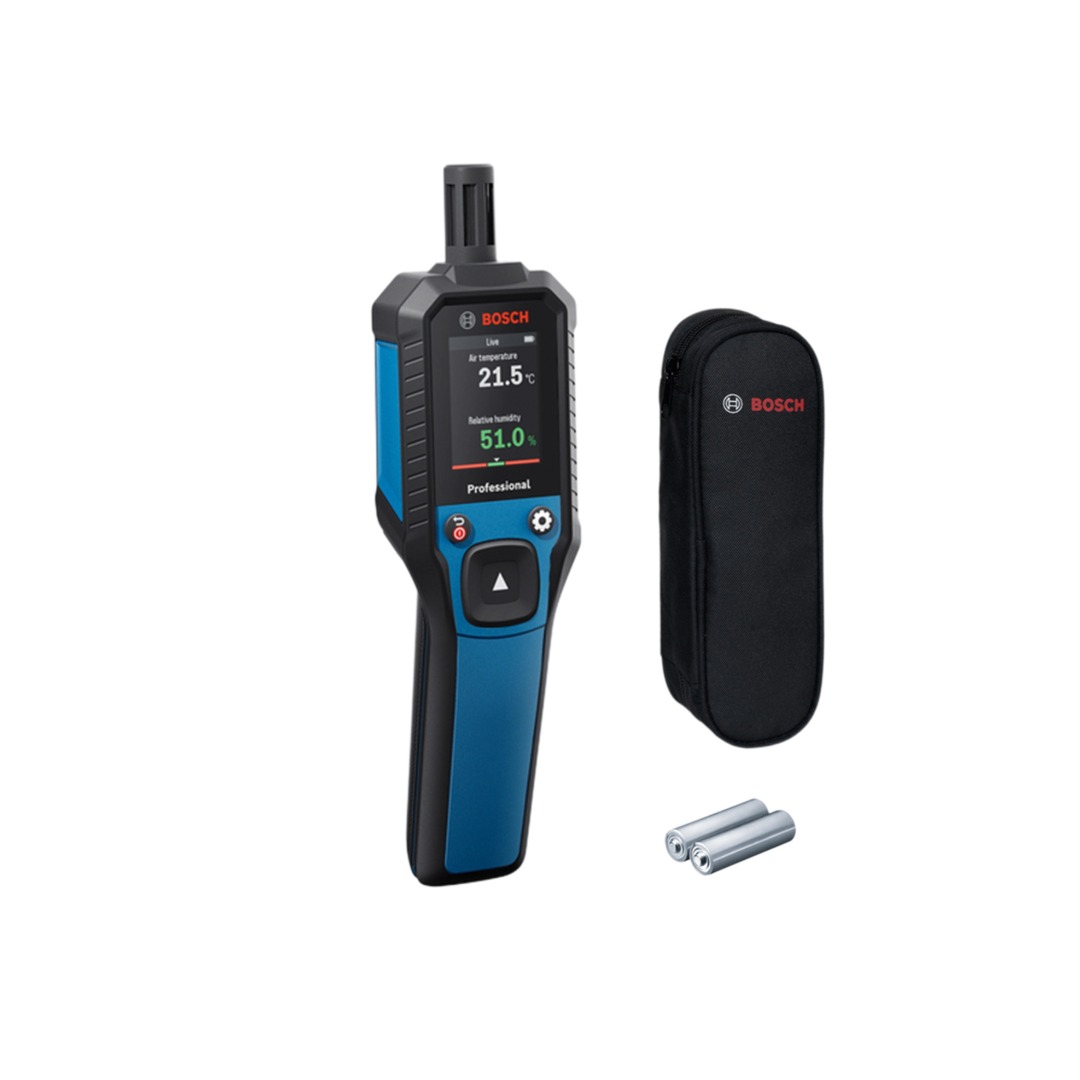 Влагомер и термометър Bosch GDH 1-17 е предназначен за точно проследяване на климатичните параметри в реално време, като отчита минимални и максимални стойности на пет основни температурни променливи. Здравият корпус с гумена защита и клас на защита IP65, както и допълнително защитеният с мембрана сензор в IP65 клетка, го правят подходящ за работа в тежки условия. Устройството разполага с висококонтрастен LCD дисплей за ясно отчитане при слабо осветление и регулируема прагова скала за лесна интерпретация на резултатите за относителна влажност. Централният бутон позволява задържане на измерените стойности за удобна справка. Уредът работи с акумулаторна батерия и е подходящ за архитекти, енергийни консултанти, строителни техници, ОВК специалисти и инспектори при оценка на влажност на въздуха, енергийна ефективност и проверка на ОВК системи.