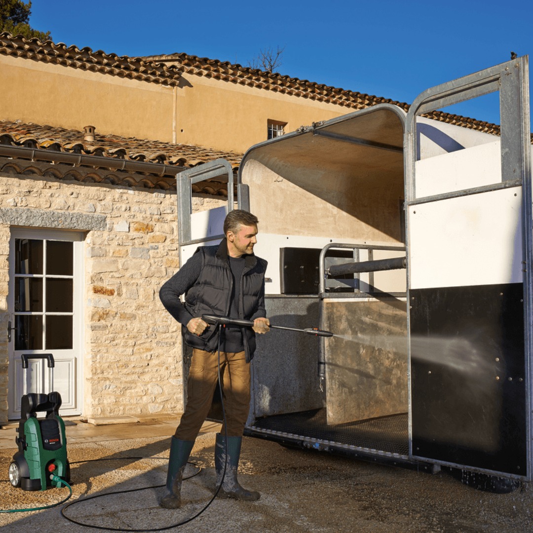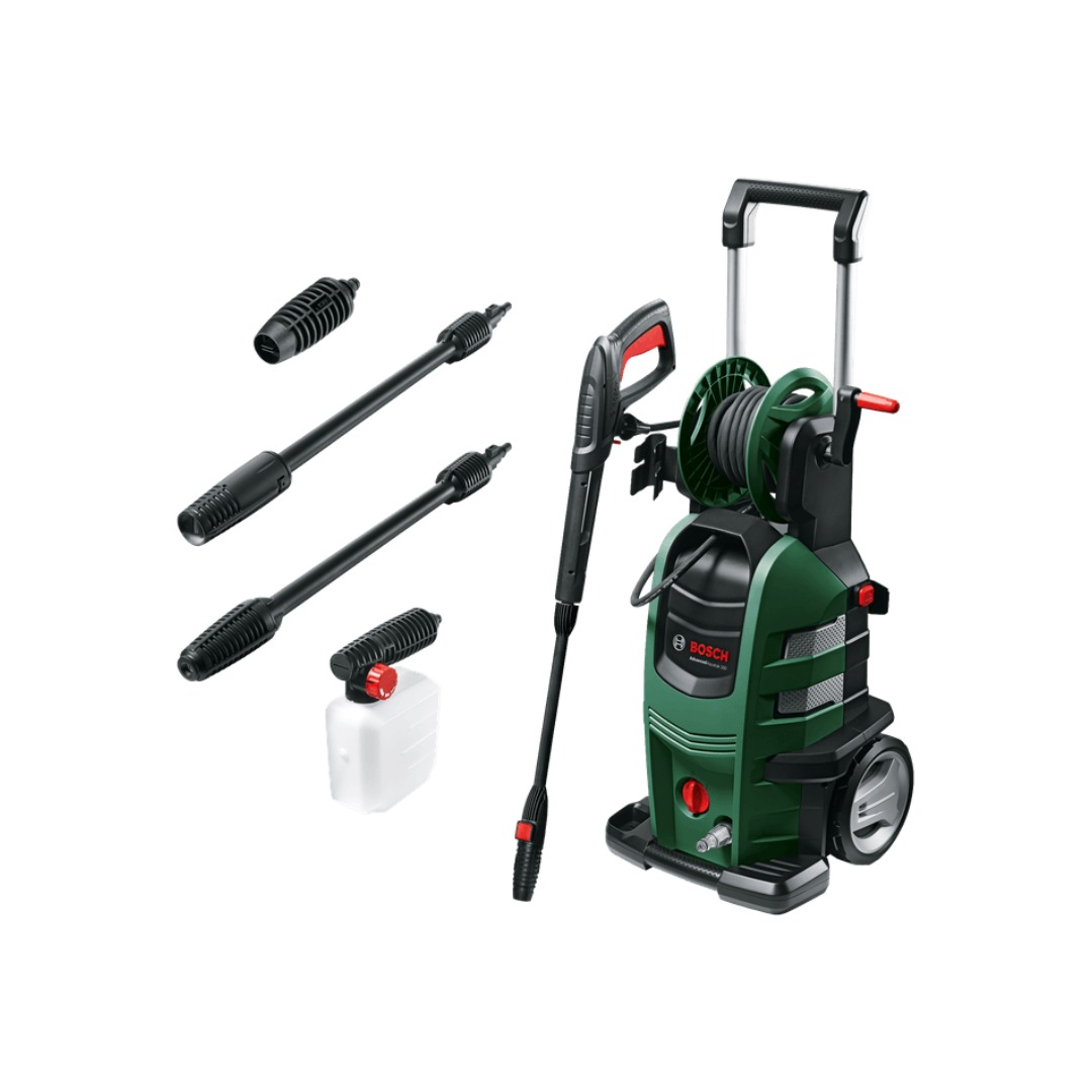 Водоструйката Bosch AdvancedAquatak 150 е предназначена за интензивно почистване на упорити замърсявания по автомобили, алеи, тераси и други външни повърхности. Моделът е оборудван с мотор с мощност 2200 W и развива максимално налягане 150 bar, което осигурява силна и постоянна струя за ефективна работа в домашни условия. Конструкцията включва индукционен мотор, 4-цилиндрова изцяло метална помпа и макара Easy-Roll за удобно прибиране на маркуча. Уредът разполага с 8 m PU маркуч за високо налягане, телескопична ръкохватка, големи колела и бързи връзки за по-лесно придвижване и бърза подготовка за работа. Системата за нанасяне на препарат под високо налягане и разнообразните дюзи правят машината подходяща за различни задачи по почистване. В комплекта са включени пистолет с метална цев, удължителна тръба, неподвижна Jet-Fan дюза и ротационна дюза.