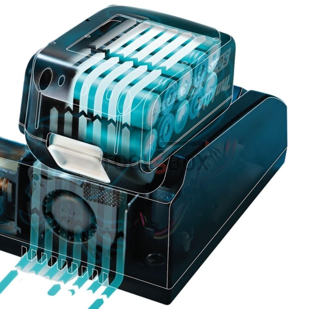 Зарядно устройство Makita DC18RЕ, проектирано да зарежда LXT и CXT батерии. Подходящo за 14.4V и 18V LXT батерии, 10.8V и 12V CXT батерии. Батериите се зареждат по реда, в който са свързани. DC18RE има вграден вентилатор за охлаждане на батерията чрез прокарване на въздух през вентилационните отвори на батерията по време на процеса на зареждане за по-бързо зареждане. Зарядното устройство комуникира с вградения в батерията чип през целия процес на зареждане, за да оптимизира живота на батерията, като активно контролира тока, напрежението и температурата. В допълнение, DC18RE е проектиран да оптимизира живота на батерията чрез активен контрол на тока, напрежението и температурата по време на зареждане.